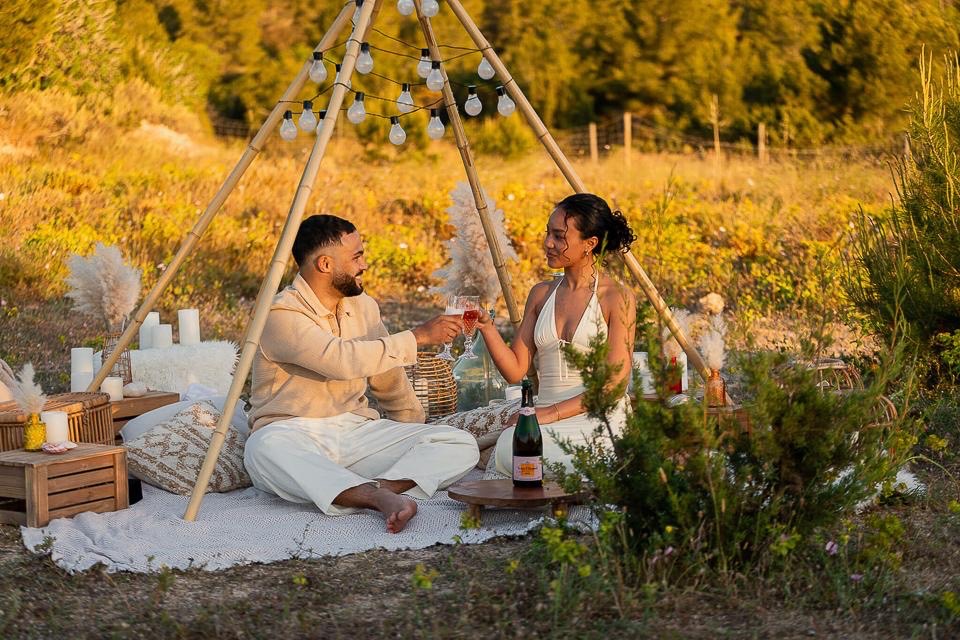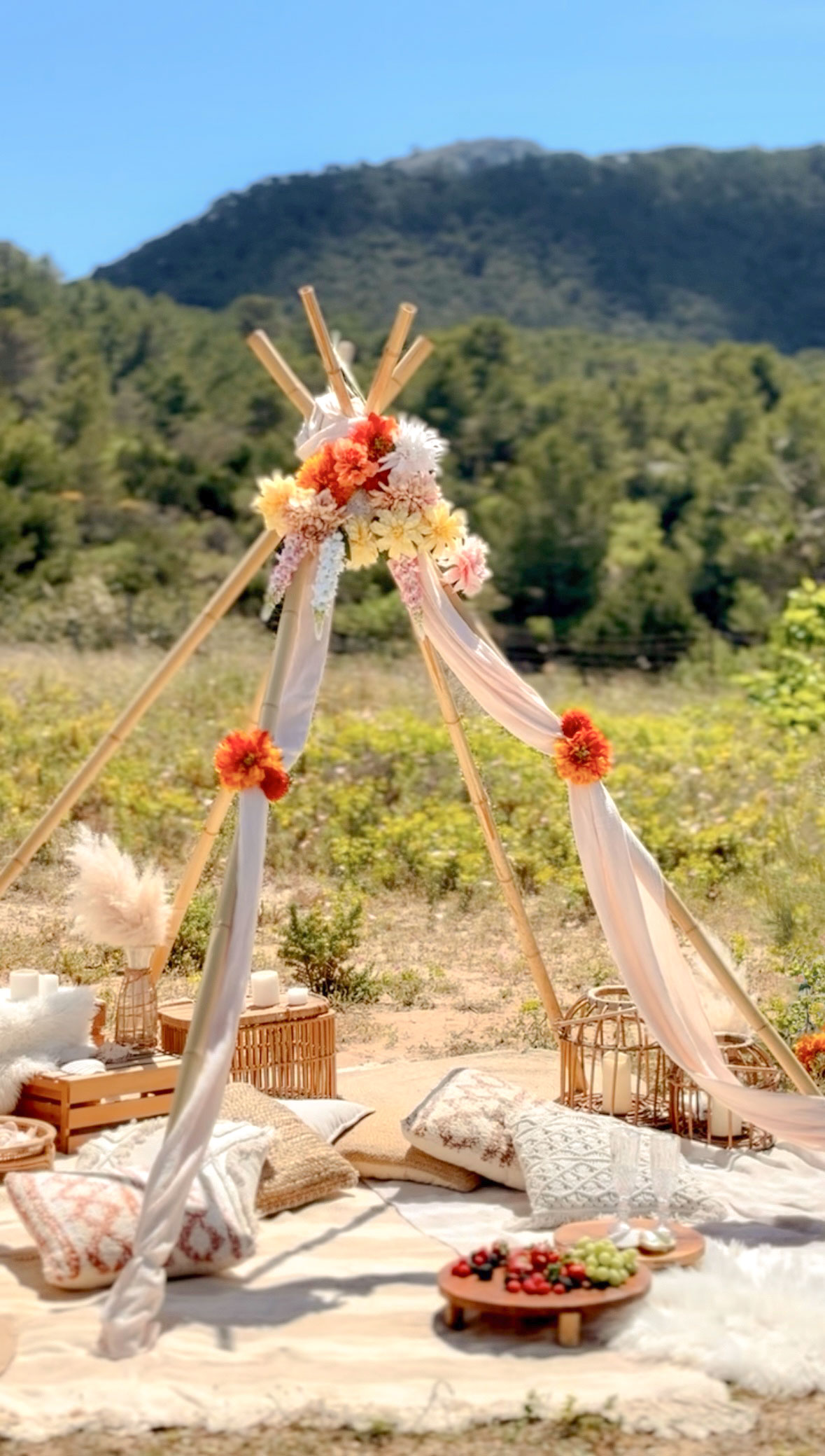 This Romantic Backdrop Setting offers a sophisticated dreamy boho setting under the Ibiza sky. Located on a private field in the South of the island with the amazing Es Vedrà in the back, this experience is designed for intimate moments at golden hour and beyond.